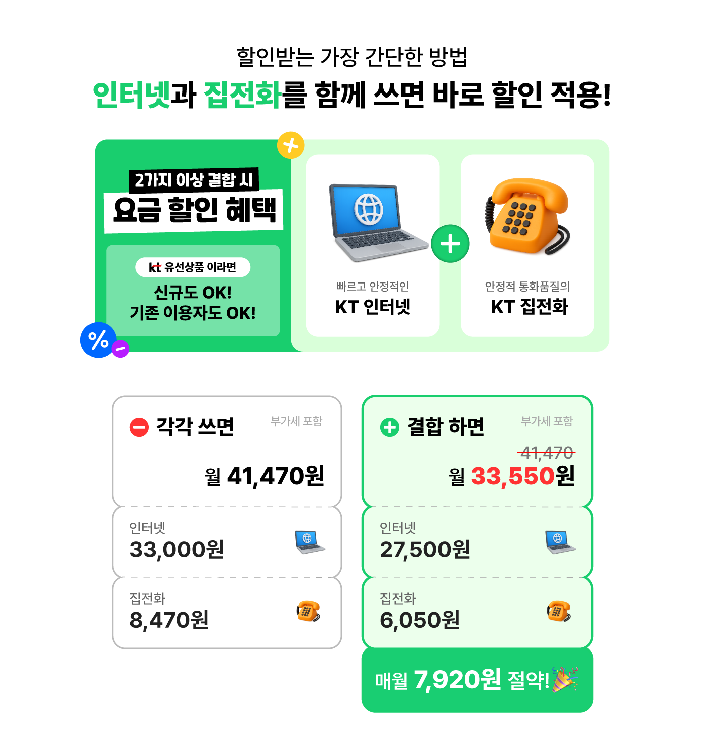 ¡Ø ÁýÀüÈ ¶Ç´Â ÀÎÅͳÝÀüÈ °áÇÕ ½Ã(¸ð¹ÙÀÏ ¶Ç´Â TV´Â °áÇÕÇÏÁö ¾ÊÀº °æ¿ì), ÀÎÅÍ³Ý ´Üǰ¿ä±Ý¿¡¼ ¿ù 2,200¿ø(3³â ¾àÁ¤ ±âÁØ) °áÇÕÇÒÀÎÀÌ Á¦°øµË´Ï´Ù.(ÀÎÅÍ³Ý ½½¸²Àº °áÇÕÇÒÀÎ ¹ÌÁ¦°ø)