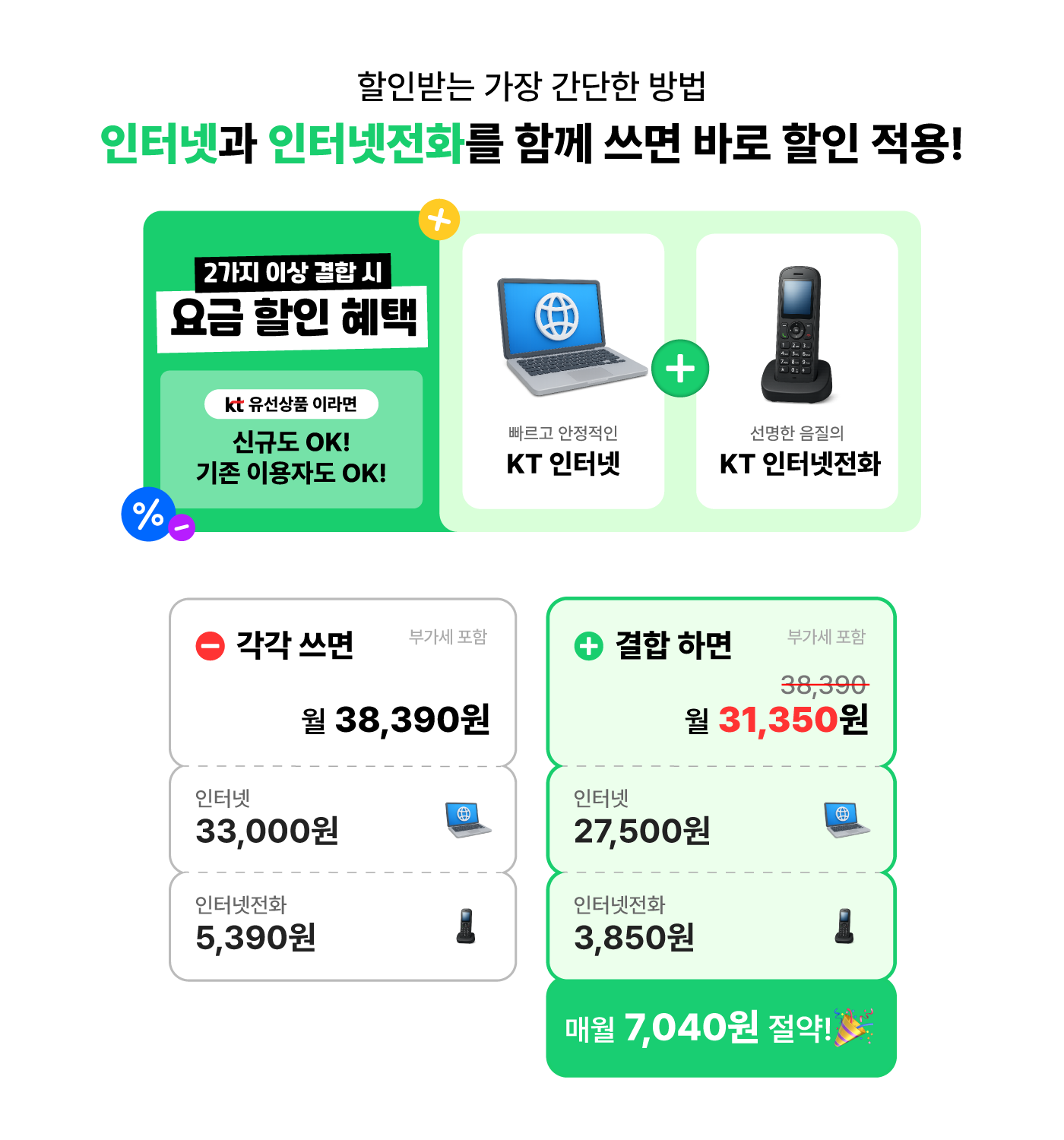 ¡Ø ÁýÀüÈ ¶Ç´Â ÀÎÅͳÝÀüÈ °áÇÕ ½Ã(¸ð¹ÙÀÏ ¶Ç´Â TV´Â °áÇÕÇÏÁö ¾ÊÀº °æ¿ì), ÀÎÅÍ³Ý ´Üǰ¿ä±Ý¿¡¼ ¿ù 2,200¿ø(3³â ¾àÁ¤ ±âÁØ) °áÇÕÇÒÀÎÀÌ Á¦°øµË´Ï´Ù.(ÀÎÅÍ³Ý ½½¸²Àº °áÇÕÇÒÀÎ ¹ÌÁ¦°ø)